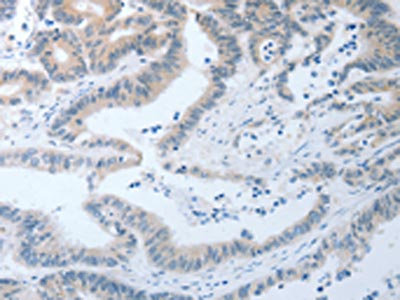 The image on the left is immunohistochemistry of paraffin-embedded Human colon cancer tissue using CSB-PA808676(LOX Antibody) at dilution 1/25, on the right is treated with synthetic peptide. (Original magnification: ×200)