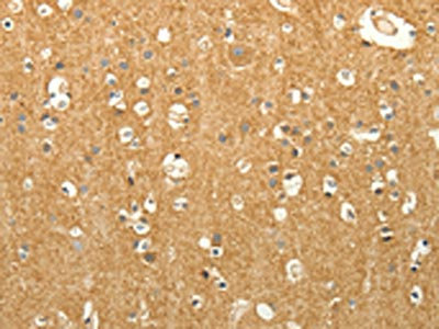 The image on the left is immunohistochemistry of paraffin-embedded Human brain tissue using CSB-PA991322(LPAR3 Antibody) at dilution 1/40, on the right is treated with synthetic peptide. (Original magnification: ×200)