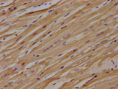 IHC image of CSB-PA013049OA01HU diluted at 1:100 and staining in paraffin-embedded human heart tissue performed on a Leica BondTM system. After dewaxing and hydration, antigen retrieval was mediated by high pressure in a citrate buffer (pH 6.0). Section was blocked with 10% normal goat serum 30min at RT. Then primary antibody (1% BSA) was incubated at 4°C overnight. The primary is detected by a biotinylated secondary antibody and visualized using an HRP conjugated SP system.
