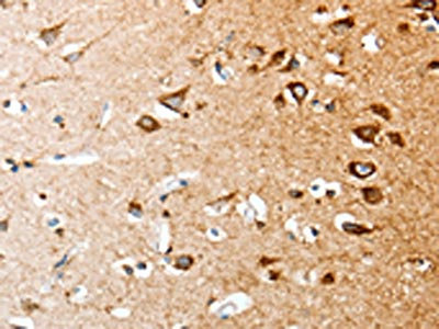 The image on the left is immunohistochemistry of paraffin-embedded Human brain tissue using CSB-PA943910(LPAR4 Antibody) at dilution 1/20, on the right is treated with synthetic peptide. (Original magnification: ×200)