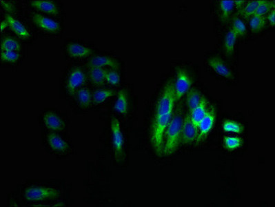 Immunofluorescent analysis of HepG2 cells using CSB-PA013050LA01HU at dilution of 1:100 and Alexa Fluor 488-congugated AffiniPure Goat Anti-Rabbit IgG(H+L)