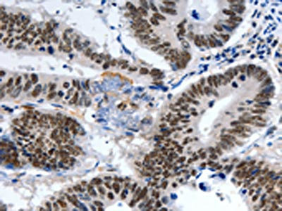 The image on the left is immunohistochemistry of paraffin-embedded Human colon cancer tissue using CSB-PA255528(LRP5 Antibody) at dilution 1/55, on the right is treated with synthetic peptide. (Original magnification: ×200)