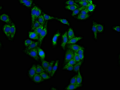 Immunofluorescence staining of HepG2 cells with CSB-PA013105LA01HU at 1:133, counter-stained with DAPI. The cells were fixed in 4% formaldehyde, permeabilized using 0.2% Triton X-100 and blocked in 10% normal Goat Serum. The cells were then incubated with the antibody overnight at 4°C. The secondary antibody was Alexa Fluor 488-congugated AffiniPure Goat Anti-Rabbit IgG(H+L).