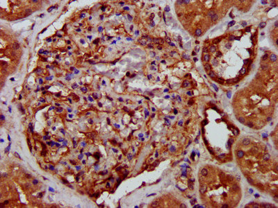 IHC image of CSB-PA013105LA01HU diluted at 1:400 and staining in paraffin-embedded human kidney tissue performed on a Leica BondTM system. After dewaxing and hydration, antigen retrieval was mediated by high pressure in a citrate buffer (pH 6.0). Section was blocked with 10% normal goat serum 30min at RT. Then primary antibody (1% BSA) was incubated at 4°C overnight. The primary is detected by a biotinylated secondary antibody and visualized using an HRP conjugated SP system.