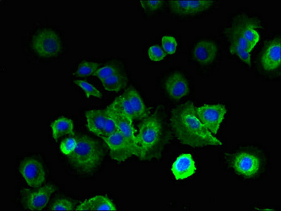 Immunofluorescent analysis of MCF-7 cells using CSB-PA888027LA01HU at dilution of 1:100 and Alexa Fluor 488-congugated AffiniPure Goat Anti-Rabbit IgG(H+L)