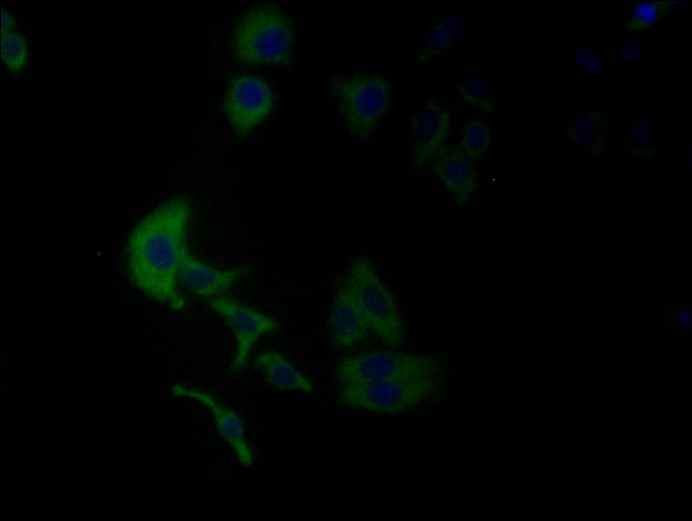 Immunofluorescence staining of HepG2 cell with CSB-PA880968LA01HU at 1:25, counter-stained with DAPI. The cells were fixed in 4% formaldehyde and blocked in 10% normal Goat Serum. The cells were then incubated with the antibody overnight at 4°C. The secondary antibody was Alexa Fluor 488-congugated AffiniPure Goat Anti-Rabbit IgG(H+L).