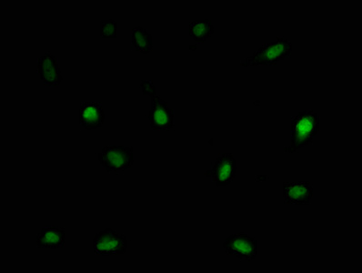 Immunofluorescence staining of U251 cells with CSB-PA013201LA01HU at 1:166, counter-stained with DAPI. The cells were fixed in 4% formaldehyde, permeabilized using 0.2% Triton X-100 and blocked in 10% normal Goat Serum. The cells were then incubated with the antibody overnight at 4°C. The secondary antibody was Alexa Fluor 488-congugated AffiniPure Goat Anti-Rabbit IgG(H+L).