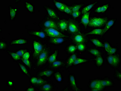 Immunofluorescence staining of Hela cells with CSB-PA00870E0Rb at 1:150, counter-stained with DAPI. The cells were fixed in 4% formaldehyde, permeabilized using 0.2% Triton X-100 and blocked in 10% normal Goat Serum. The cells were then incubated with the antibody overnight at 4°C. The secondary antibody was Alexa Fluor 488-congugated AffiniPure Goat Anti-Rabbit IgG(H+L).