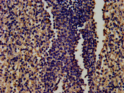 IHC image of CSB-PA00870E0Rb diluted at 1:450 and staining in paraffin-embedded human spleen tissue performed on a Leica BondTM system. After dewaxing and hydration, antigen retrieval was mediated by high pressure in a citrate buffer (pH 6.0). Section was blocked with 10% normal goat serum 30min at RT. Then primary antibody (1% BSA) was incubated at 4°C overnight. The primary is detected by a biotinylated secondary antibody and visualized using an HRP conjugated SP system.