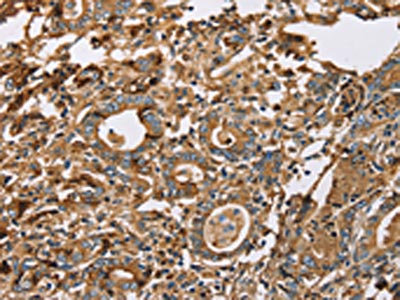 The image on the left is immunohistochemistry of paraffin-embedded Human gastric cancer tissue using CSB-PA242213(LTF Antibody) at dilution 1/50, on the right is treated with fusion protein. (Original magnification: ×200)