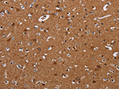 The image on the left is immunohistochemistry of paraffin-embedded Human brain tissue using CSB-PA788951(LUM Antibody) at dilution 1/20, on the right is treated with fusion protein. (Original magnification: ×200)