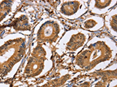 The image on the left is immunohistochemistry of paraffin-embedded Human colon cancer tissue using CSB-PA206136(LXN Antibody) at dilution 1/25, on the right is treated with fusion protein. (Original magnification: ×200)