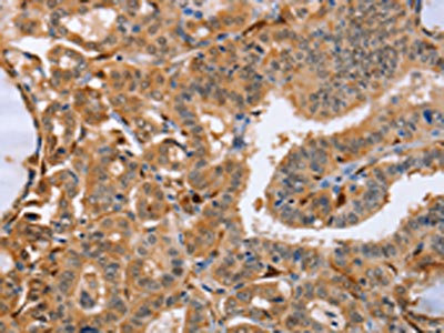 The image on the left is immunohistochemistry of paraffin-embedded Human thyroid cancer tissue using CSB-PA206136(LXN Antibody) at dilution 1/25, on the right is treated with fusion protein. (Original magnification: ×200)
