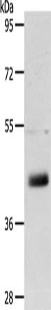 Gel: 10%SDS-PAGE, Lysate: 40 μg, Lane: A431 cells, Primary antibody: CSB-PA561582(LYVE1 Antibody) at dilution 1/150, Secondary antibody: Goat anti rabbit IgG at 1/8000 dilution, Exposure time: 10 minutes