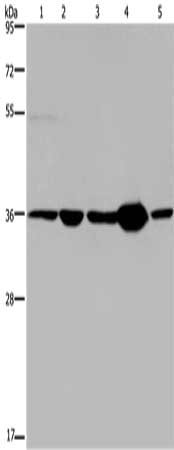 Gel: 8%SDS-PAGE, Lysate: 40 μg, Lane 1-5: Human transitional cell carcinoma tissue, 293T cells, A172 cells, human testis tissue, Hela cells, Primary antibody: CSB-PA217118(LZTFL1 Antibody) at dilution 1/550, Secondary antibody: Goat anti rabbit IgG at 1/8000 dilution, Exposure time: 20 seconds