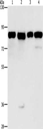 Gel: 8%SDS-PAGE, Lysate: 40 μg, Lane 1-4: Hela cells, 231 cells, hepG2 cells, Raji cells, Primary antibody: CSB-PA133797(MAD1L1 Antibody) at dilution 1/500, Secondary antibody: Goat anti rabbit IgG at 1/8000 dilution, Exposure time: 1 second