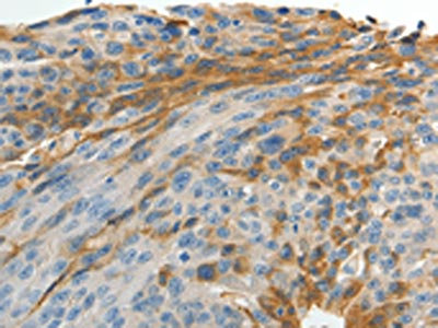 The image on the left is immunohistochemistry of paraffin-embedded Human ovarian cancer tissue using CSB-PA209741(MAD2L1 Antibody) at dilution 1/25, on the right is treated with fusion protein. (Original magnification: ×200)