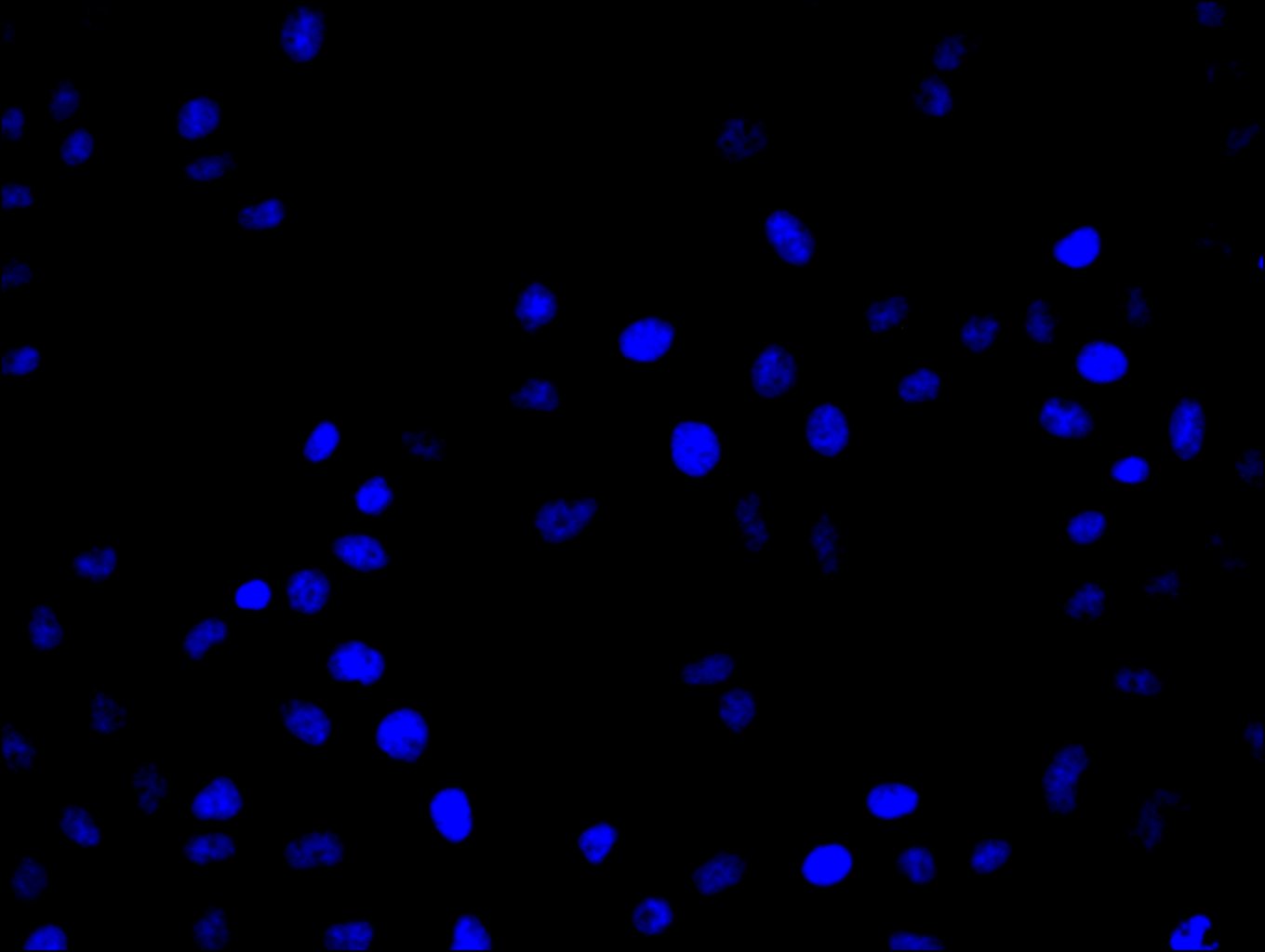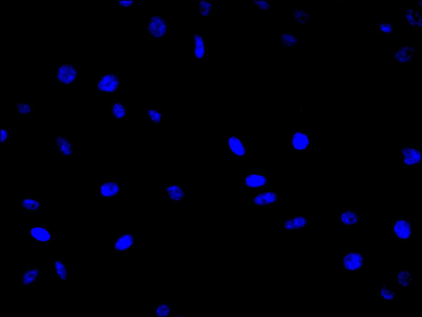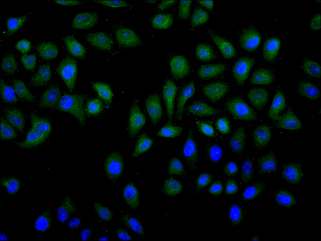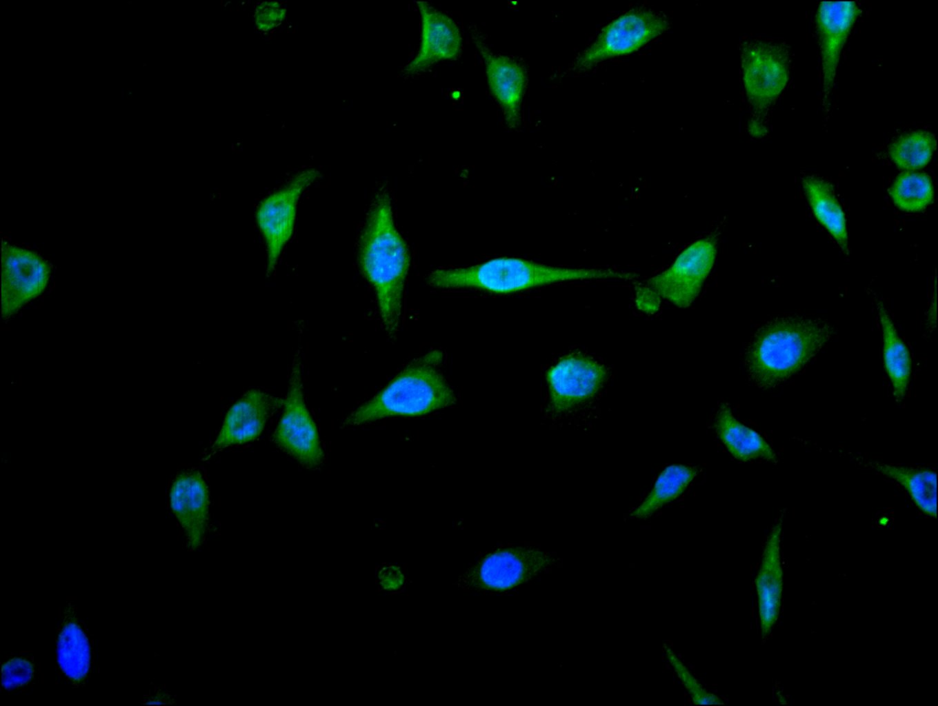 Immunofluorescence staining of Hela cell with 5% goat serum, counter-stained with DAPI. The cells were fixed in 4% formaldehyde and blocked in 10% normal Goat Serum. The cells were then incubated with the antibody overnight at 4C. The secondary antibody was Alexa Fluor 488-congugated AffiniPure Goat Anti-Rabbit IgG(H+L).