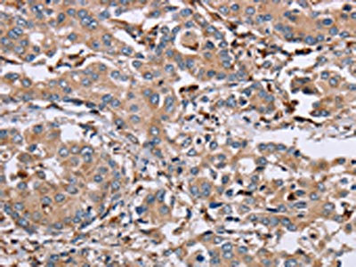 The image on the left is immunohistochemistry of paraffin-embedded Human liver cancer tissue using CSB-PA146268(MAGEA3 Antibody) at dilution 1/50, on the right is treated with synthetic peptide. (Original magnification: ×200)