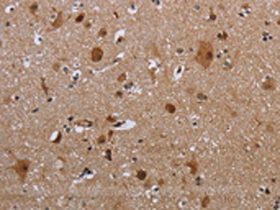 The image on the left is immunohistochemistry of paraffin-embedded Human brain tissue using CSB-PA652649(MAGEB18 Antibody) at dilution 1/20, on the right is treated with synthetic peptide. (Original magnification: ×200)