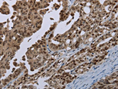 The image on the left is immunohistochemistry of paraffin-embedded Human ovarian cancer tissue using CSB-PA652649(MAGEB18 Antibody) at dilution 1/20, on the right is treated with synthetic peptide. (Original magnification: ×200)