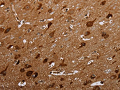 The image on the left is immunohistochemistry of paraffin-embedded Human brain tissue using CSB-PA615826(MAGEC2 Antibody) at dilution 1/40, on the right is treated with synthetic peptide. (Original magnification: ×200)