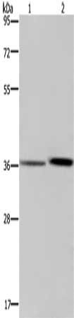 Gel: 8%SDS-PAGE, Lysate: 40 μg, Lane 1-2: A549 cells, human fetal liver tissue, Primary antibody: CSB-PA272625(MAGEF1 Antibody) at dilution 1/300, Secondary antibody: Goat anti rabbit IgG at 1/8000 dilution, Exposure time: 1 minute