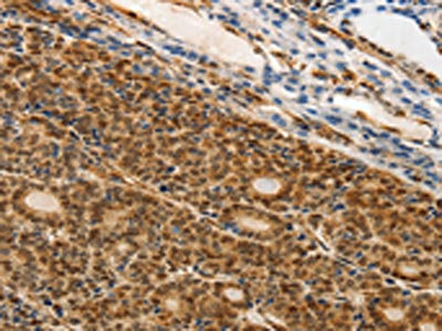 The image on the left is immunohistochemistry of paraffin-embedded Human thyroid cancer tissue using CSB-PA906125(MAP1A Antibody) at dilution 1/25, on the right is treated with synthetic peptide. (Original magnification: ×200)