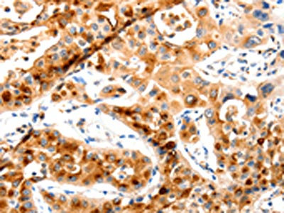 The image on the left is immunohistochemistry of paraffin-embedded Human ovarian cancer tissue using CSB-PA224661(MAP2K2 Antibody) at dilution 1/20, on the right is treated with synthetic peptide. (Original magnification: ×200)