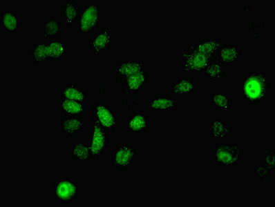Immunofluorescent analysis of A549 cells using CSB-PA013412LA01HU at dilution of 1:100 and Alexa Fluor 488-congugated AffiniPure Goat Anti-Rabbit IgG(H+L)