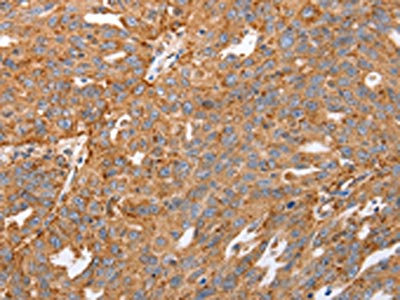 The image on the left is immunohistochemistry of paraffin-embedded Human ovarian cancer tissue using CSB-PA975112(MAP2K5 Antibody) at dilution 1/40, on the right is treated with fusion protein. (Original magnification: ×200)