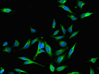 Immunofluorescent analysis of Hela cells using CSB-PA013435LA01HU at dilution of 1:100 and Alexa Fluor 488-congugated AffiniPure Goat Anti-Rabbit IgG(H+L)