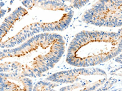 The image on the left is immunohistochemistry of paraffin-embedded Human colon cancer tissue using CSB-PA900670(MAP4K1 Antibody) at dilution 1/30, on the right is treated with synthetic peptide. (Original magnification: ×200)