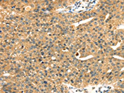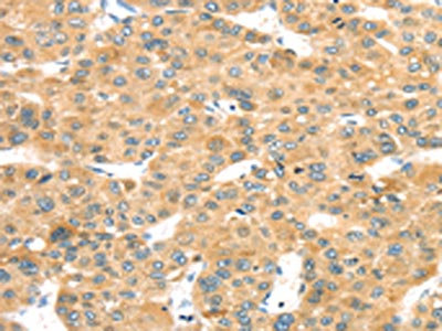 The image on the left is immunohistochemistry of paraffin-embedded Human liver cancer tissue using CSB-PA644665(MAPK12 Antibody) at dilution 1/25, on the right is treated with fusion protein. (Original magnification: ×200)