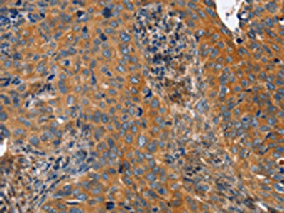 The image on the left is immunohistochemistry of paraffin-embedded Human cervical cancer tissue using CSB-PA553472(MAPK15 Antibody) at dilution 1/15, on the right is treated with fusion protein. (Original magnification: ×200)