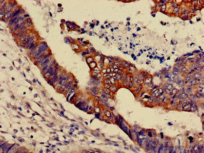 IHC image of CSB-PA013456LA01HU diluted at 1:600 and staining in paraffin-embedded human colon cancer performed on a Leica BondTM system. After dewaxing and hydration, antigen retrieval was mediated by high pressure in a citrate buffer (pH 6.0). Section was blocked with 10% normal goat serum 30min at RT. Then primary antibody (1% BSA) was incubated at 4°C overnight. The primary is detected by a biotinylated secondary antibody and visualized using an HRP conjugated SP system.