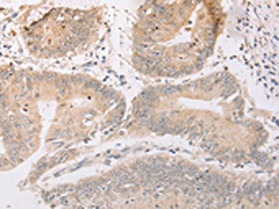 The image on the left is immunohistochemistry of paraffin-embedded Human colon cancer tissue using CSB-PA907425(MARK1 Antibody) at dilution 1/30, on the right is treated with fusion protein. (Original magnification: ×200)