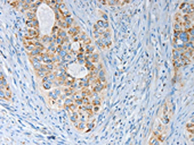 The image on the left is immunohistochemistry of paraffin-embedded Human cervical cancer tissue using CSB-PA267095(MARK2 Antibody) at dilution 1/15, on the right is treated with synthetic peptide. (Original magnification: ×200)