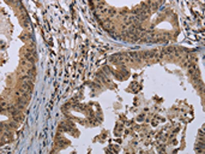 The image on the left is immunohistochemistry of paraffin-embedded Human gastric cancer tissue using CSB-PA227420(MCC Antibody) at dilution 1/30, on the right is treated with synthetic peptide. (Original magnification: ×200)