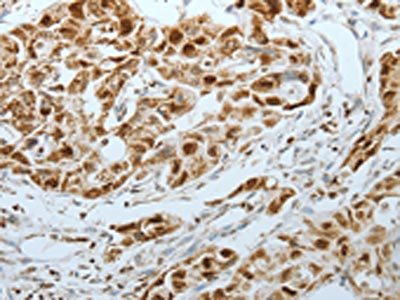 The image on the left is immunohistochemistry of paraffin-embedded Human lung cancer tissue using CSB-PA110553(MCM3 Antibody) at dilution 1/25, on the right is treated with fusion protein. (Original magnification: ×200)