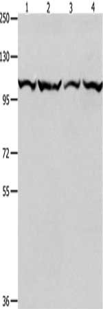 Gel: 8%SDS-PAGE, Lysate: 40 μg, Lane 1-4: K562 cells, Jurkat cells, hela cells, 293T cells, Primary antibody: CSB-PA110553(MCM3 Antibody) at dilution 1/550, Secondary antibody: Goat anti rabbit IgG at 1/8000 dilution, Exposure time: 1 minute
