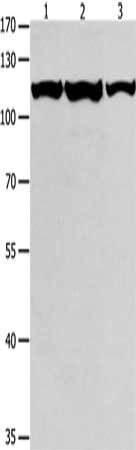 Gel: 8%SDS-PAGE, Lysate: 40 μg, Lane 1-3: K562 cells, Jurkat cells, hela cells, Primary antibody: CSB-PA969629(MCM3 Antibody) at dilution 1/550, Secondary antibody: Goat anti rabbit IgG at 1/8000 dilution, Exposure time: 1 minute