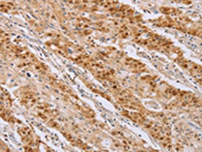 The image on the left is immunohistochemistry of paraffin-embedded Human gastic cancer tissue using CSB-PA243587(MCM5 Antibody) at dilution 1/40, on the right is treated with fusion protein. (Original magnification: ×200)