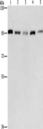 Gel: 6%SDS-PAGE, Lysate: 40 μg, Lane 1-5: HepG2 cells, K562 cells, Jurkat cells, 231 cells, hela cells, Primary antibody: CSB-PA243587(MCM5 Antibody) at dilution 1/475, Secondary antibody: Goat anti rabbit IgG at 1/8000 dilution, Exposure time: 30 seconds