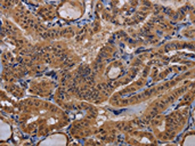 The image on the left is immunohistochemistry of paraffin-embedded Human thyroid cancer tissue using CSB-PA200543(MCTS1 Antibody) at dilution 1/60, on the right is treated with fusion protein. (Original magnification: ×200)