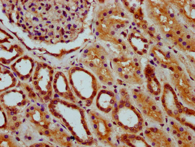 IHC image of CSB-PA872530LA01HU diluted at 1:200 and staining in paraffin-embedded human kidney tissue performed on a Leica BondTM system. After dewaxing and hydration, antigen retrieval was mediated by high pressure in a citrate buffer (pH 6.0). Section was blocked with 10% normal goat serum 30min at RT. Then primary antibody (1% BSA) was incubated at 4°C overnight. The primary is detected by a biotinylated secondary antibody and visualized using an HRP conjugated SP system.