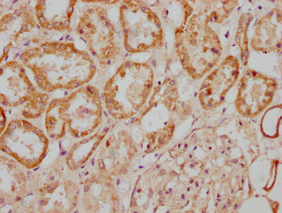 IHC image of CSB-PA890781LA01HU diluted at 1:300 and staining in paraffin-embedded human kidney tissue performed on a Leica BondTM system. After dewaxing and hydration, antigen retrieval was mediated by high pressure in a citrate buffer (pH 6.0). Section was blocked with 10% normal goat serum 30min at RT. Then primary antibody (1% BSA) was incubated at 4°C overnight. The primary is detected by a biotinylated secondary antibody and visualized using an HRP conjugated SP system.