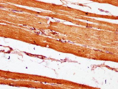 IHC image of CSB-PA839291LA01HU diluted at 1:600 and staining in paraffin-embedded human skeletal muscle tissue performed on a Leica BondTM system. After dewaxing and hydration, antigen retrieval was mediated by high pressure in a citrate buffer (pH 6.0). Section was blocked with 10% normal goat serum 30min at RT. Then primary antibody (1% BSA) was incubated at 4°C overnight. The primary is detected by a biotinylated secondary antibody and visualized using an HRP conjugated SP system.