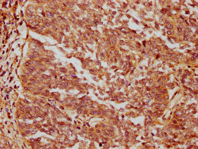 IHC image of CSB-PA874795LA01HU diluted at 1:200 and staining in paraffin-embedded human cervical cancer performed on a Leica BondTM system. After dewaxing and hydration, antigen retrieval was mediated by high pressure in a citrate buffer (pH 6.0). Section was blocked with 10% normal goat serum 30min at RT. Then primary antibody (1% BSA) was incubated at 4°C overnight. The primary is detected by a biotinylated secondary antibody and visualized using an HRP conjugated SP system.