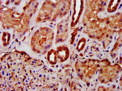 IHC image of CSB-PA06867A0Rb diluted at 1:400 and staining in paraffin-embedded human kidney tissue performed on a Leica BondTM system. After dewaxing and hydration, antigen retrieval was mediated by high pressure in a citrate buffer (pH 6.0). Section was blocked with 10% normal goat serum 30min at RT. Then primary antibody (1% BSA) was incubated at 4°C overnight. The primary is detected by a biotinylated secondary antibody and visualized using an HRP conjugated SP system.